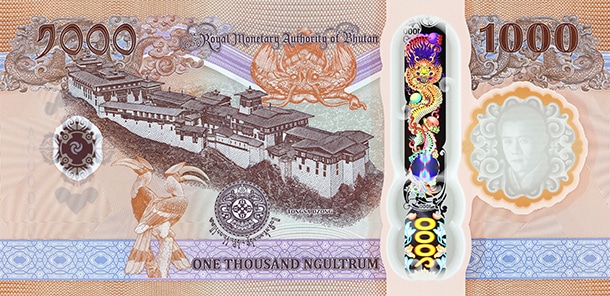 The front of the banknote of 1,000 ngultrum (BTN1,000.3) shows the portrait of Ugyen Wangchuck, the first King of Bhutan, seated against the Wheel of the Universal Ruler, wearing the Raven Crown.