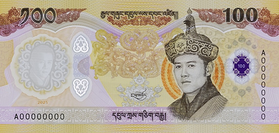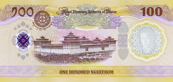 The 100 ngultrum note (BTN100.7) has the portrait of King Jigme Khesar Namgyel Wangchuck wearing the Raven Crown with nine dragons. In the back is shown Tashicho Dzong topped by the Garuda and the state seal.