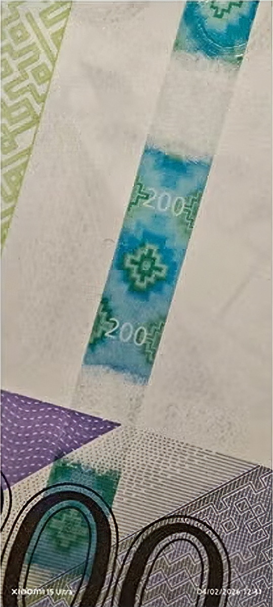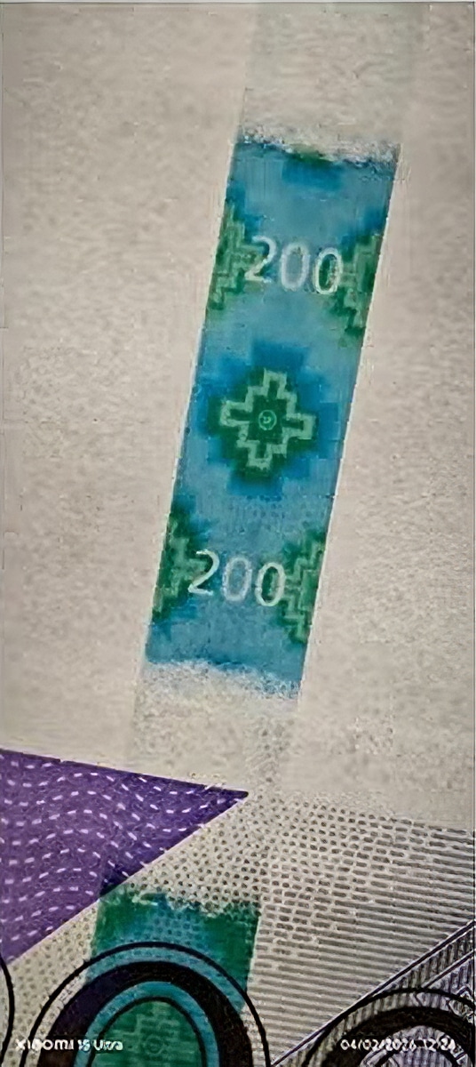 This banknote has an improved 5 mm segmented security strip, instead of the 4 mm strip of the 2021 variety (PEN200.4A.)